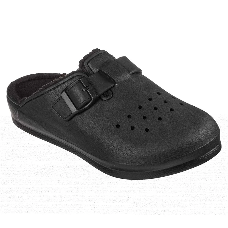 Relax in easy-wearing plush comfort with Foamies; Cali Surf Lined. This sculpted comfort slip-on clog features a flexible perforated EVA upper with a buckle accent and a sherpa lined contoured cushioned footbed.